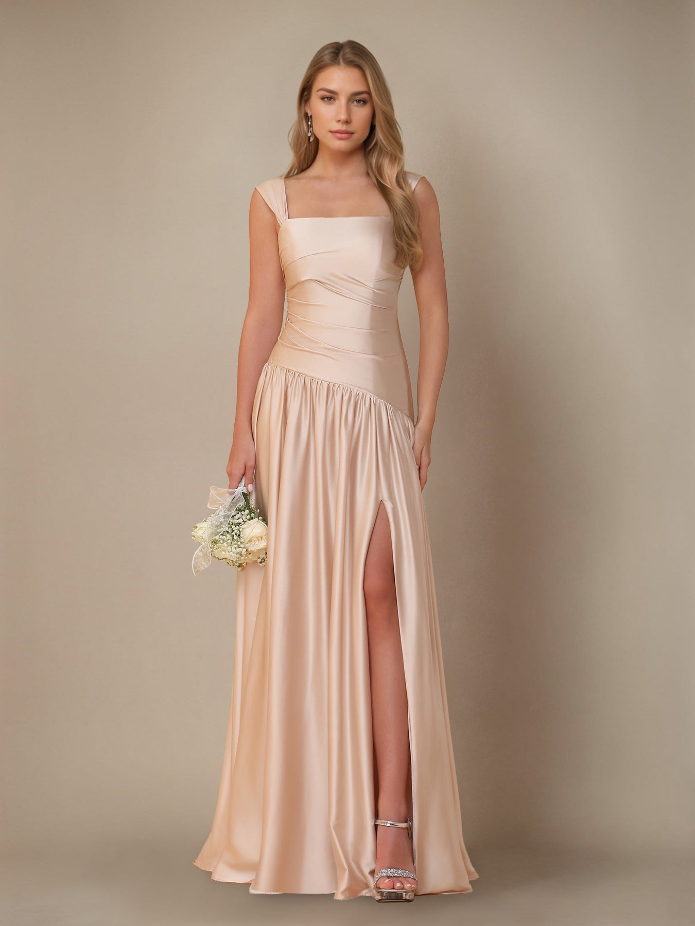 MON5412257 MONDRESSY A-Line/Princess Off-the-Shoulder Sleeveless Floor-Length Silk Satin Bridesmaid Dresses with Pleated & Split Side