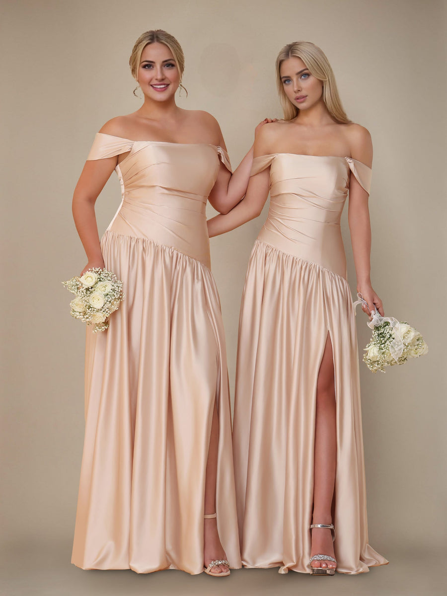 A-Line/Princess Off-the-Shoulder Sleeveless Floor-Length Silk Satin Bridesmaid Dresses with Pleated & Split Side