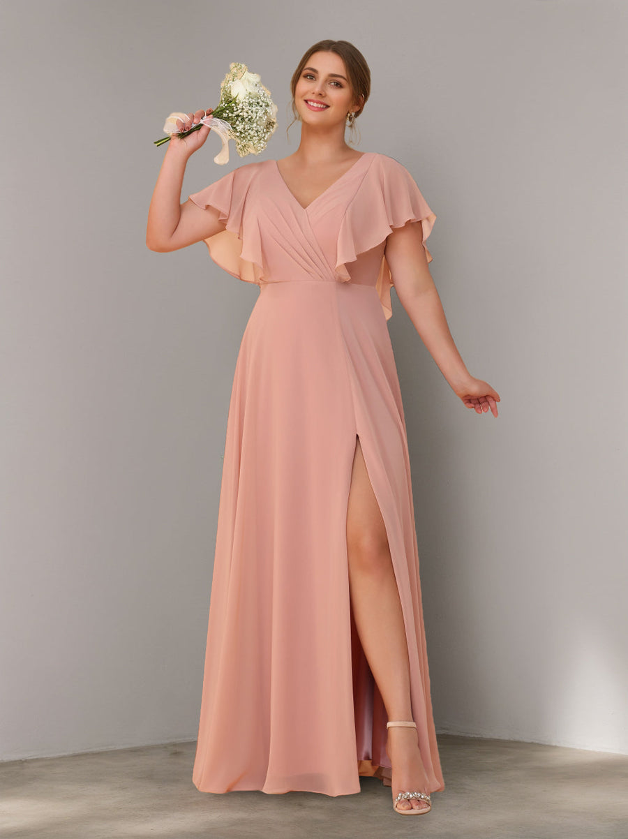 A-Line/Princess V-Neck Short Sleeves Chiffon Floor-Length Plus Size Bridesmaid Dresses with Split Side & Ruched