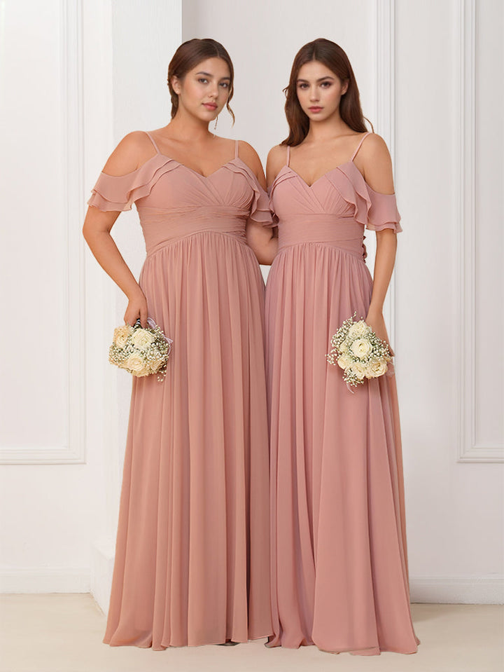 A-Line/Princess V-Neck Spaghetti Straps Sleeveless Floor-Length Chiffon Bridesmaid Dresses with Ruffles