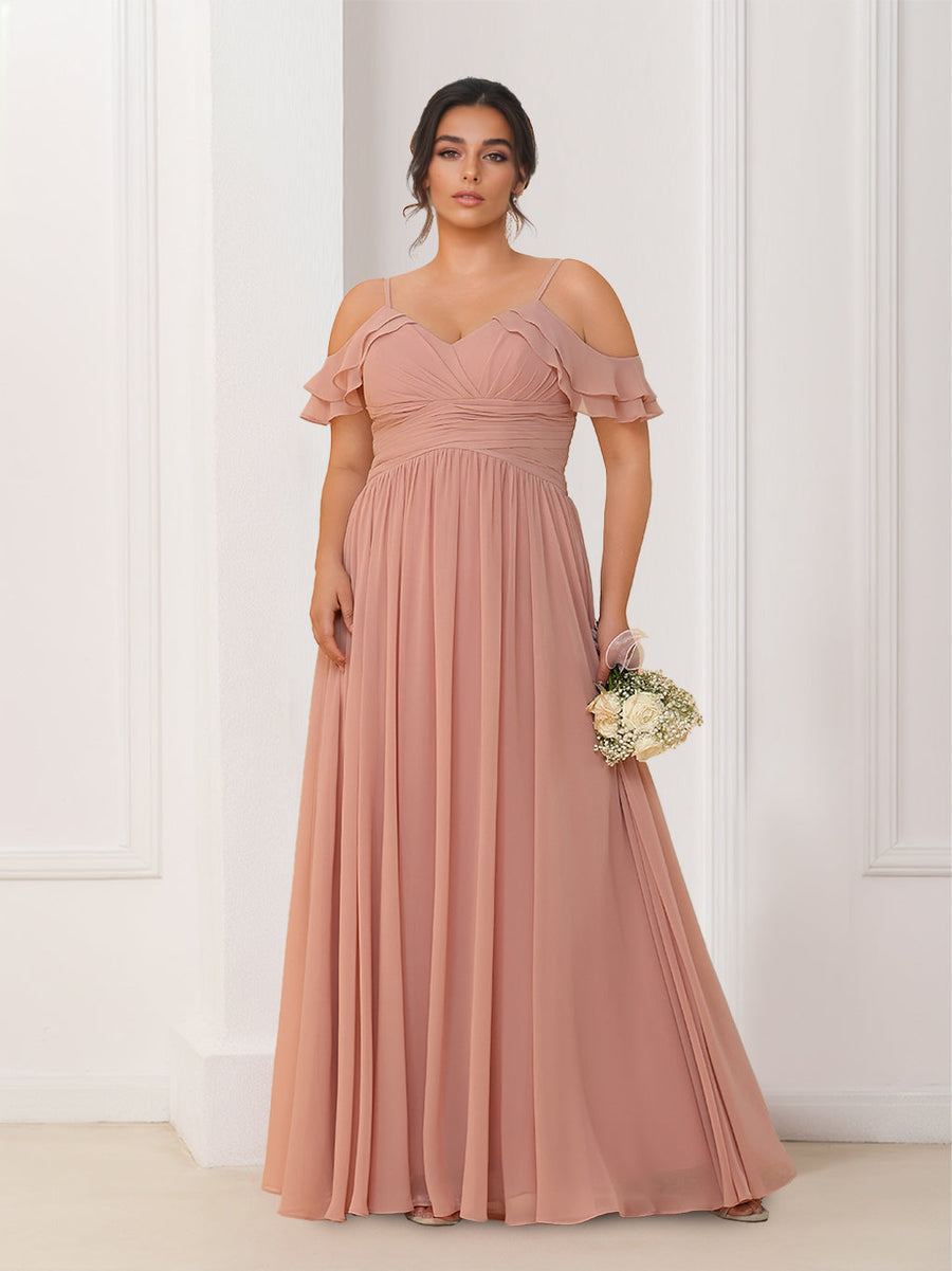 A-Line/Princess V-Neck Spaghetti Straps Sleeveless Floor-Length Chiffon Plus Size Bridesmaid Dresses with Ruffles