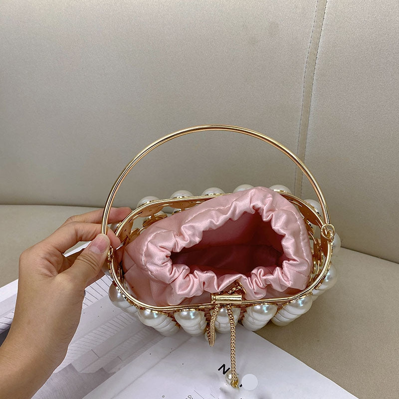 Champagne Elegant Velvet Wedding Party Evening Chain Clutch Bag with White Pearls