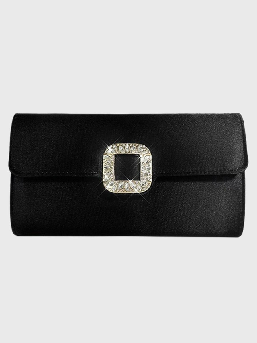 Black Satin Elegant Clutch Bag with Rhinestone Buckle