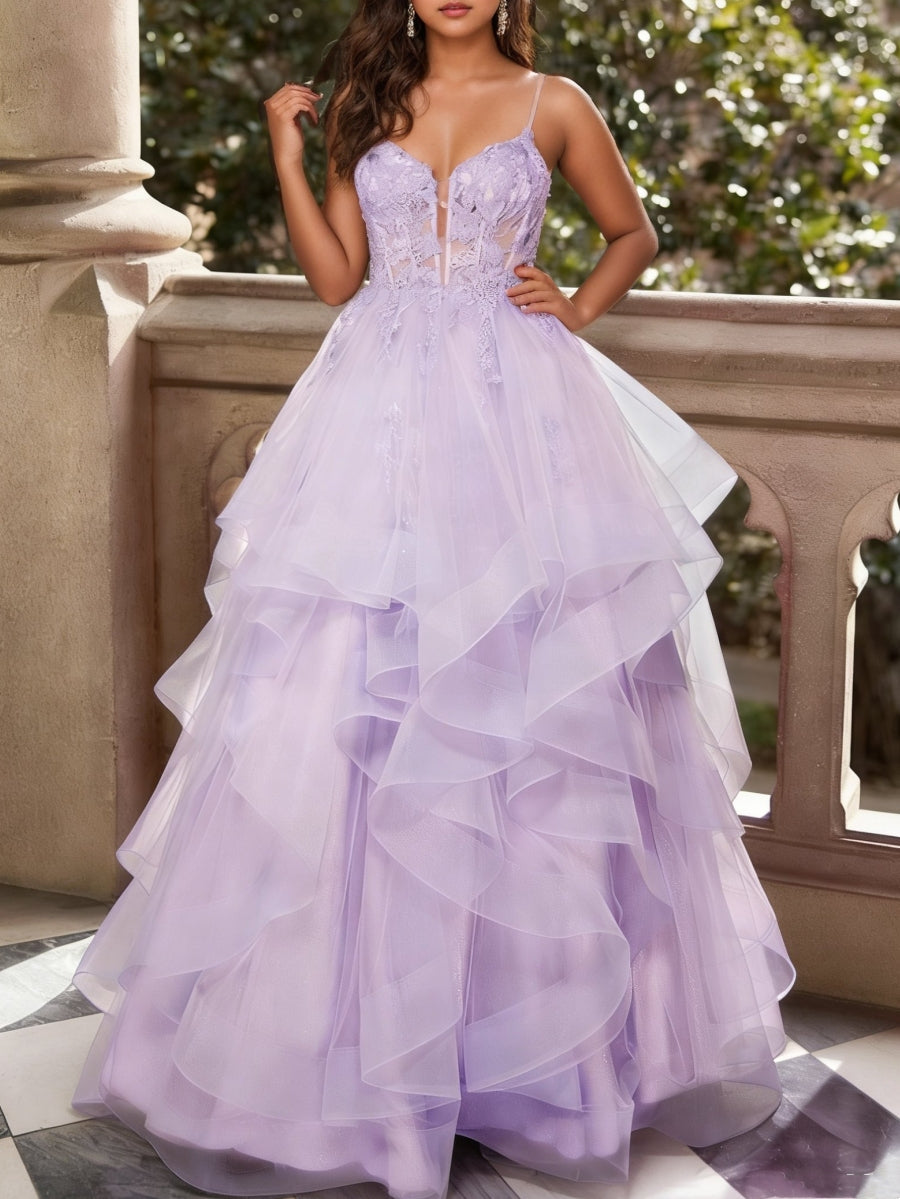 A-Line/Princess V-Neck Tulle Formal Dresses Ruffles Floor-Length Sleeveless Formal Dresses
