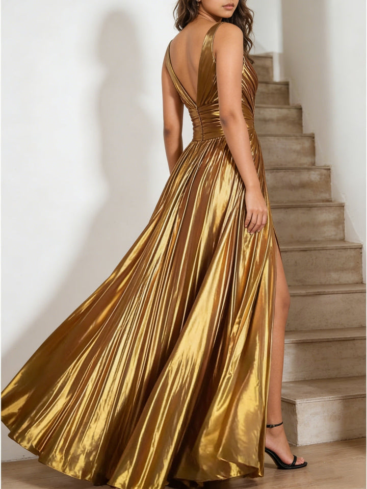 A-Line/Princess V-Neck Metallic Formal Dresses with Split Side Floor-Length Pleated Formal Dresses
