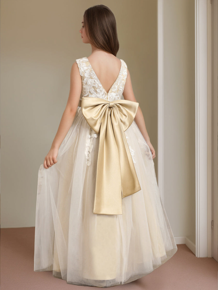 A-Line/Princess V-Neck Sleeveless Floor-Length Flower Girl Dress with Bowknot