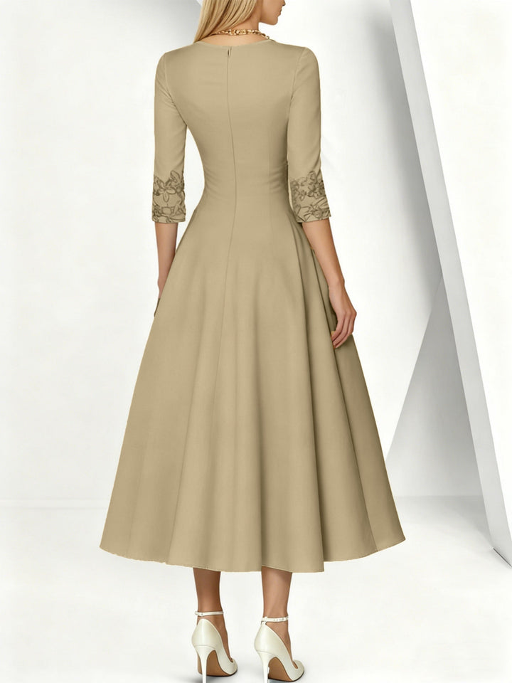 A-Line/Princess V-Neck Satin Mother of the Bride Dresses 3/4 Sleeves Pleated Lace Tea-Length