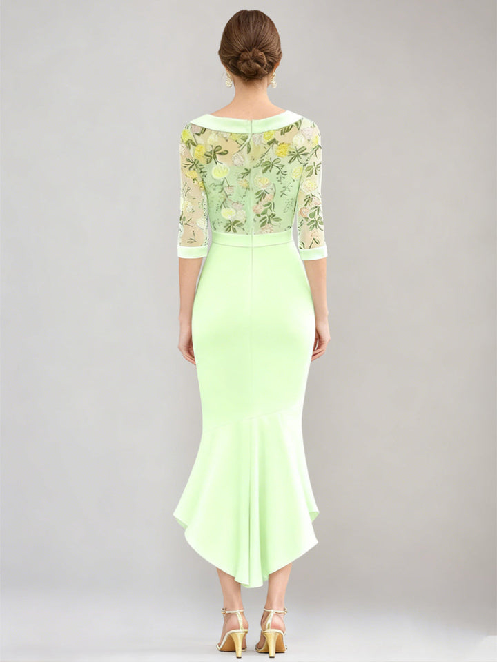 Trumpet/Mermaid Scoop Stretch Satin Mother of the Bride Dresses Floral Lace Half Sleeves Tea-Length Cocktail Dress