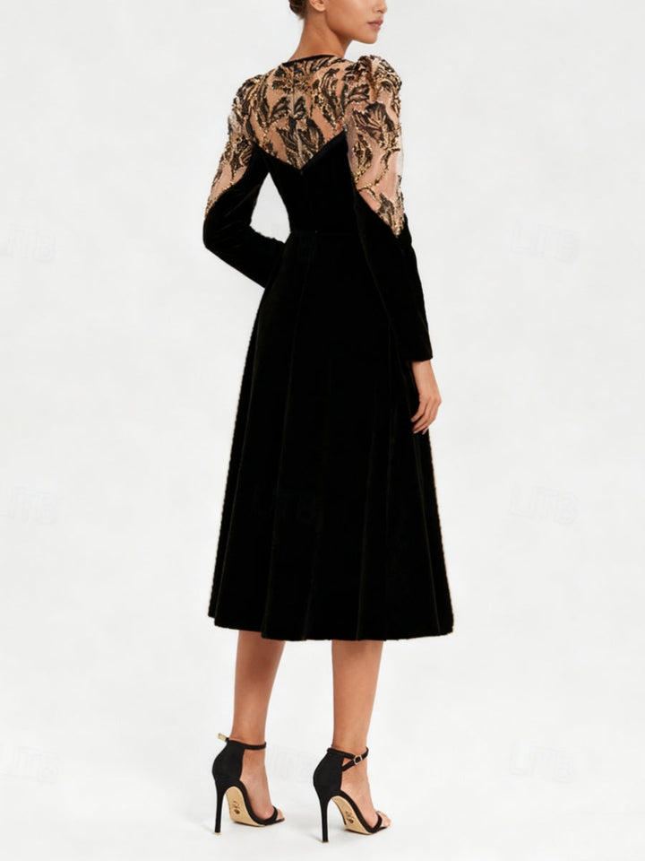 A-Line/Princess Scoop Velvet Mother of the Bride Dresses Long Sleeves Tea-Length Lace