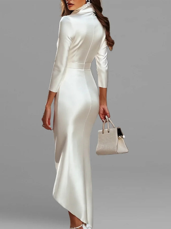 A-Line/Princess Satin One-Shoulder Cocktail Dresses Long Sleeves Pleated Ankle-Length Evening Dress Formal Dress
