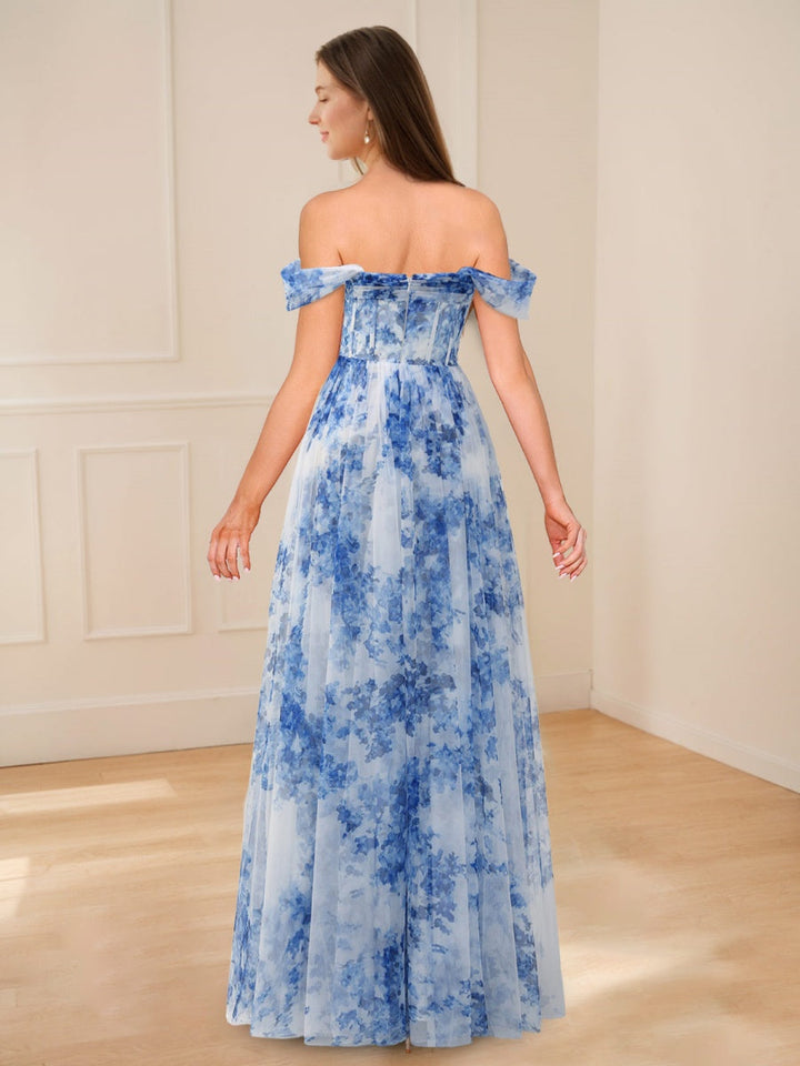 A-Line/Princess Off-the-shoulder Pleated Floor-Length Printed Floral Evening Dresses with Side Slit