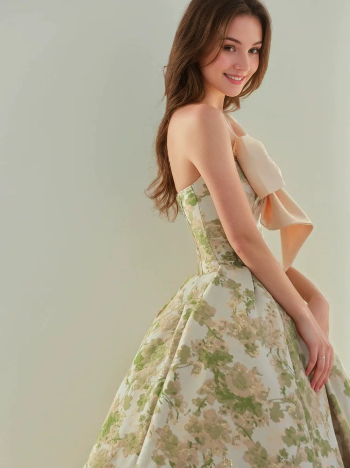 A-Line/Princess Strapless Sleeveless Pleated Printed Floral Evening Dresses with Bow & Jewel Appliques