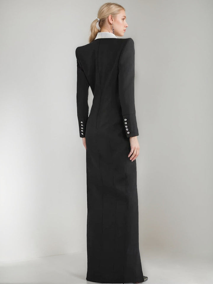 Sheath/Column Plunge V-Neck Peaked Lapel Long Sleeves Floor-Length Evening Dresses with Slit & Pockets & Buttons