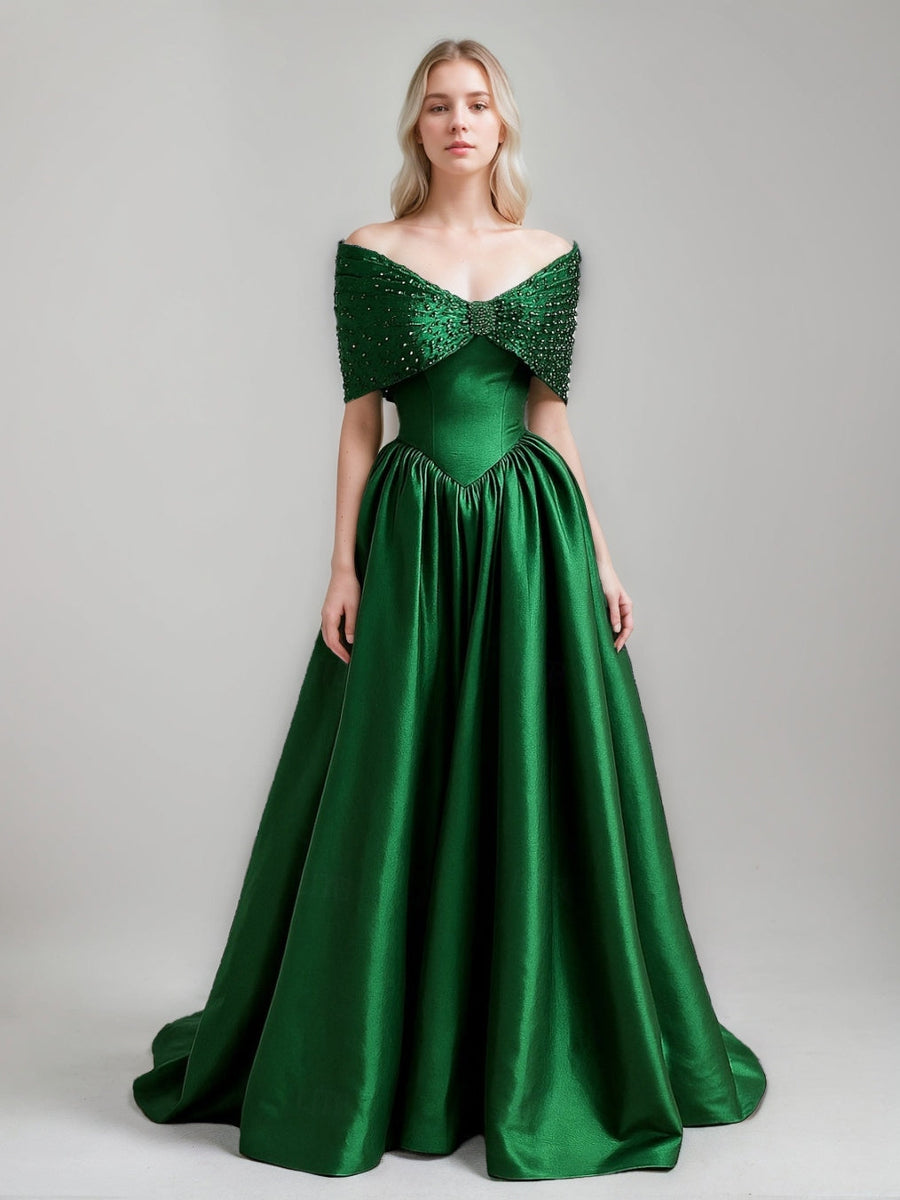 A-Line/Princess Off-the-Shoulder Half Sleeves Floor-Length Pleated Evening Dresses with Pearls & Beads