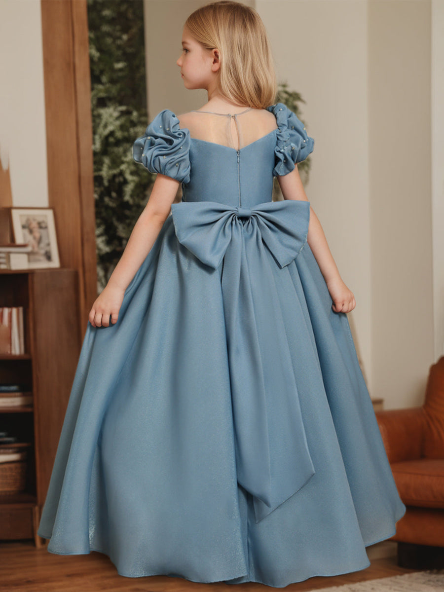 Ball-Gown Jewel Neck Puff Sleeves Floor-Length Pleated Flower Girl Dresses with Pearls