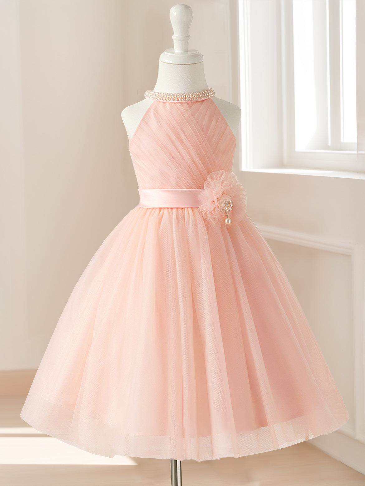 MON11113140 MONDRESSY A-Line/Princess Halter Sleeveless Knee-Length Ruched Flower Girl Dresses with Sash & Pearls & Self-tie
