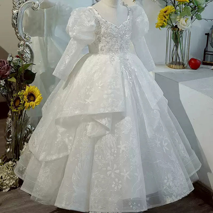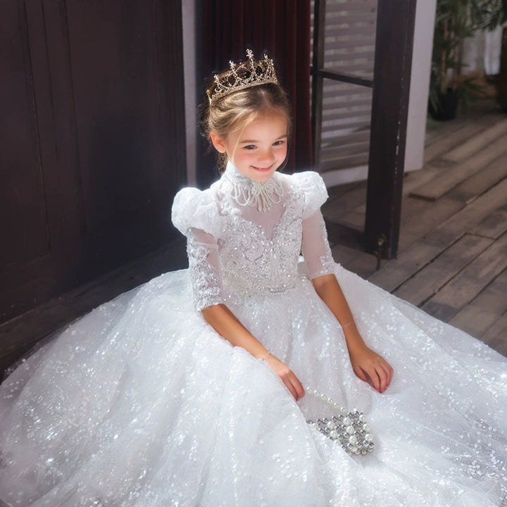 Sweetheart Long Sleeves Ball Gown Flower Girl Party Lace Dress with Crystal Appliques