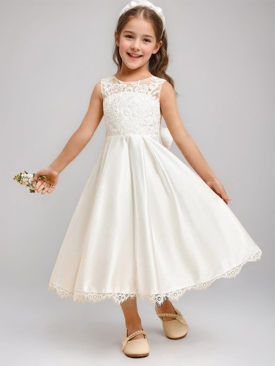 A-Line/Princess Scoop Sleeveless Tea-Length Pleated Flower Girl Dresses with Lace Appliques & Bow