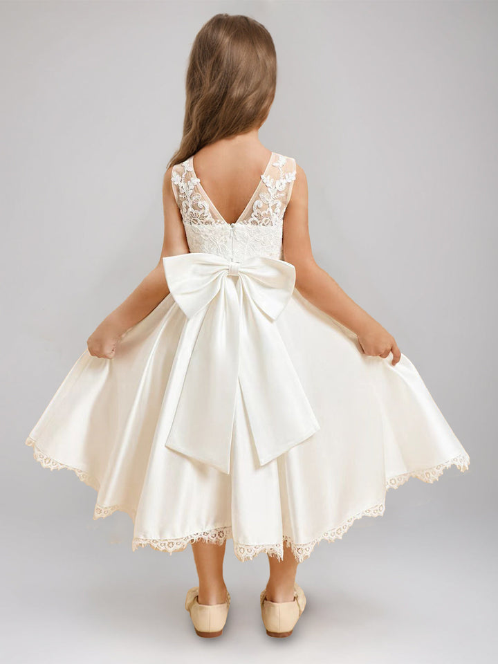 A-Line/Princess V-Neck Sleeveless Tea-Length Flower Girl Dresses with Bow & Lace Appliques