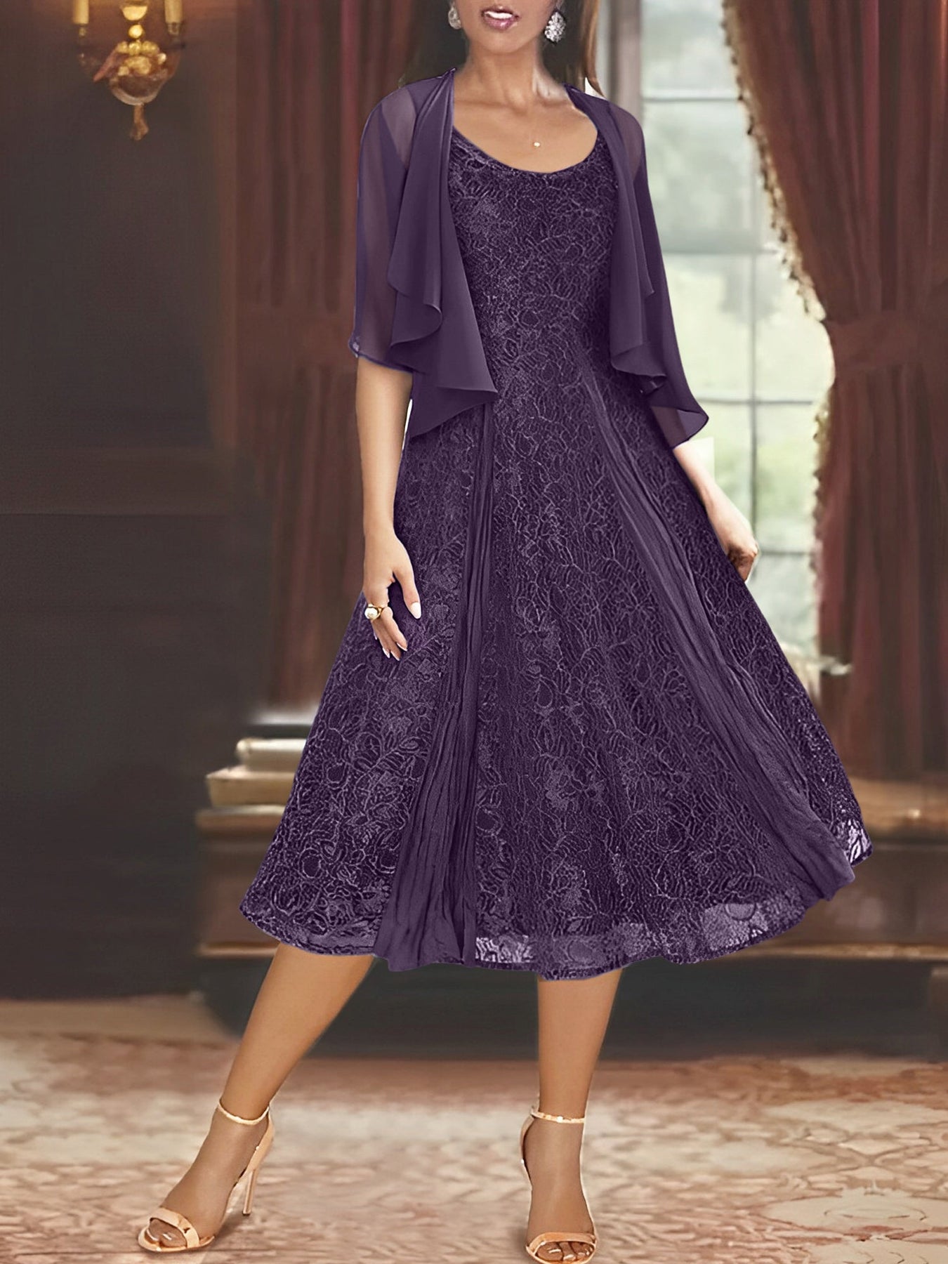 MON2311229 MONDRESSY A-Line/Princess Scoop Half Sleeves Tea-Length Mother of the Bride Dresses with Appliques & Wrap