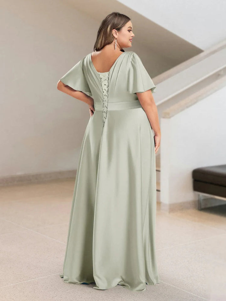 A-Line/Princess V-Neck Short Sleeves Silk Satin Plus Size Bridesmaid Dresses with Pockets