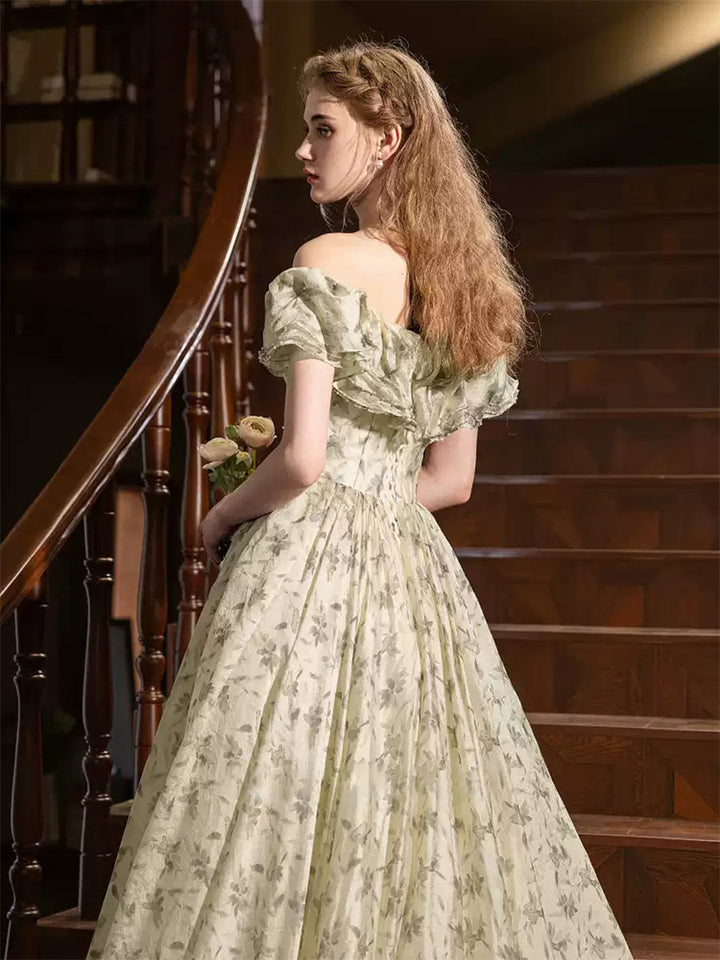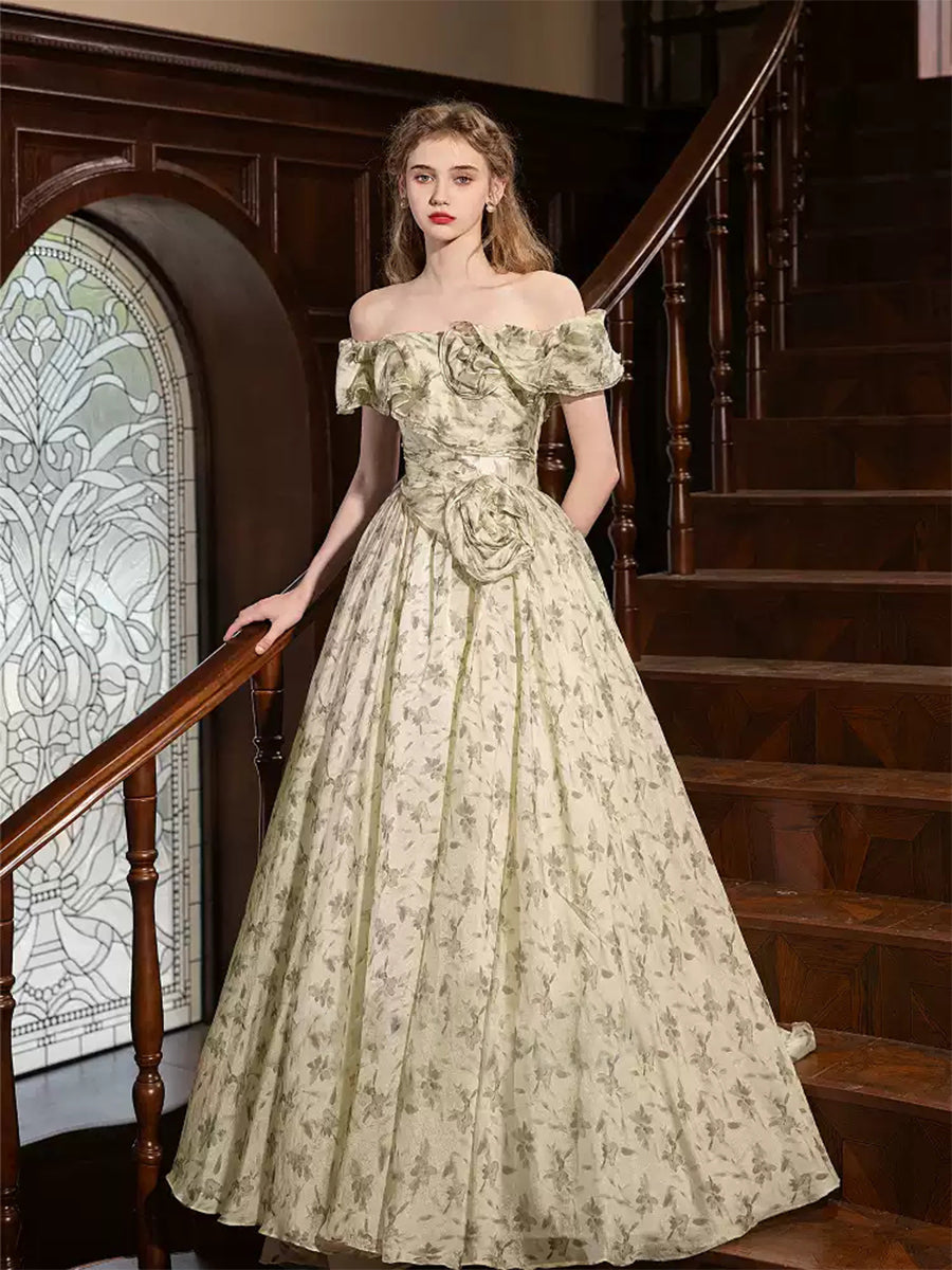 Ball Gown Off-the-shoulder Floor-Length Printed Floral Pleated Formal Dresses with 3D Flowers & Ruffles