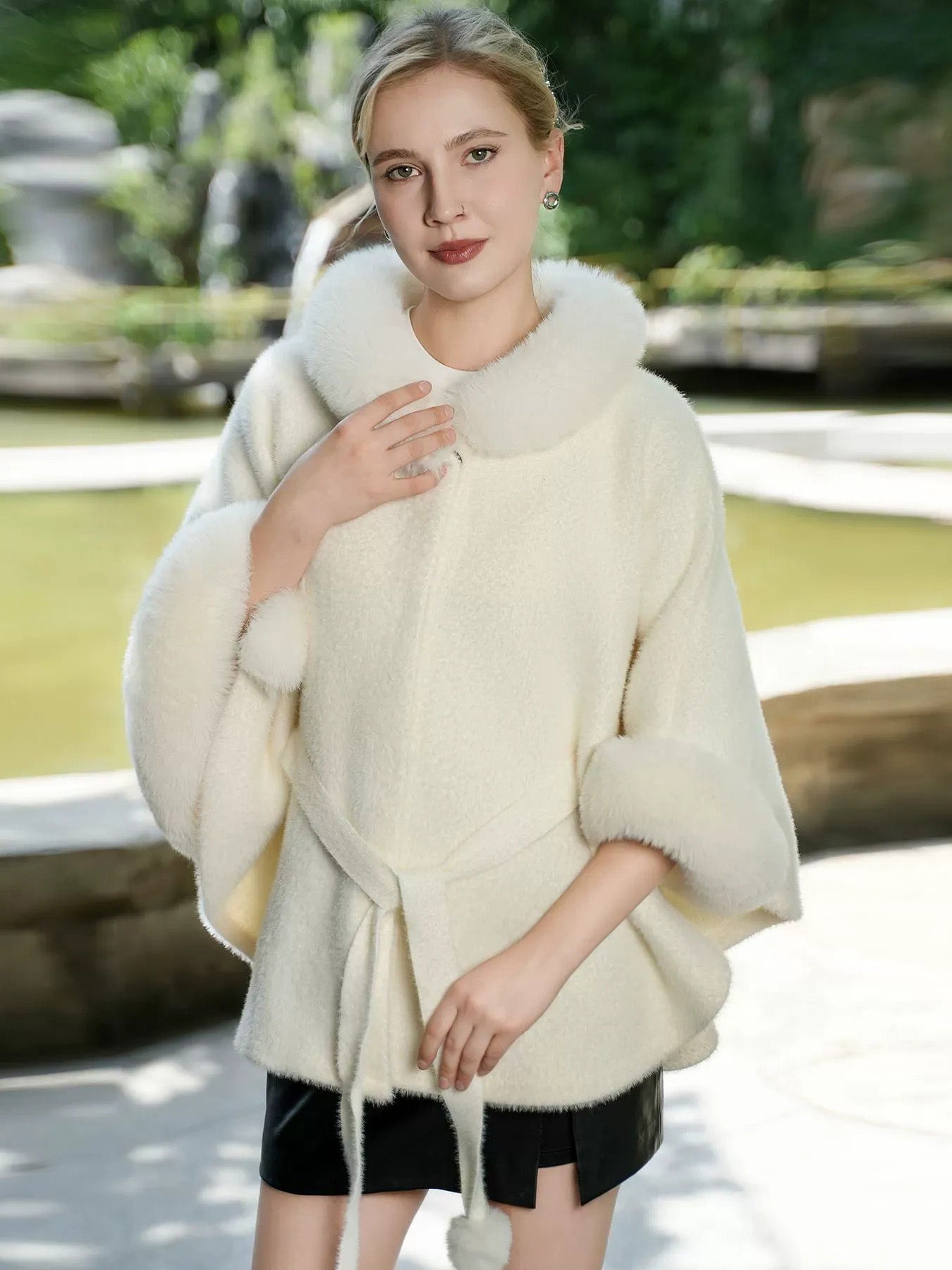 MON9041095W MONDRESSY Elegant White Faux Fur Trim Belted Cape Shawl/Wrap for Women