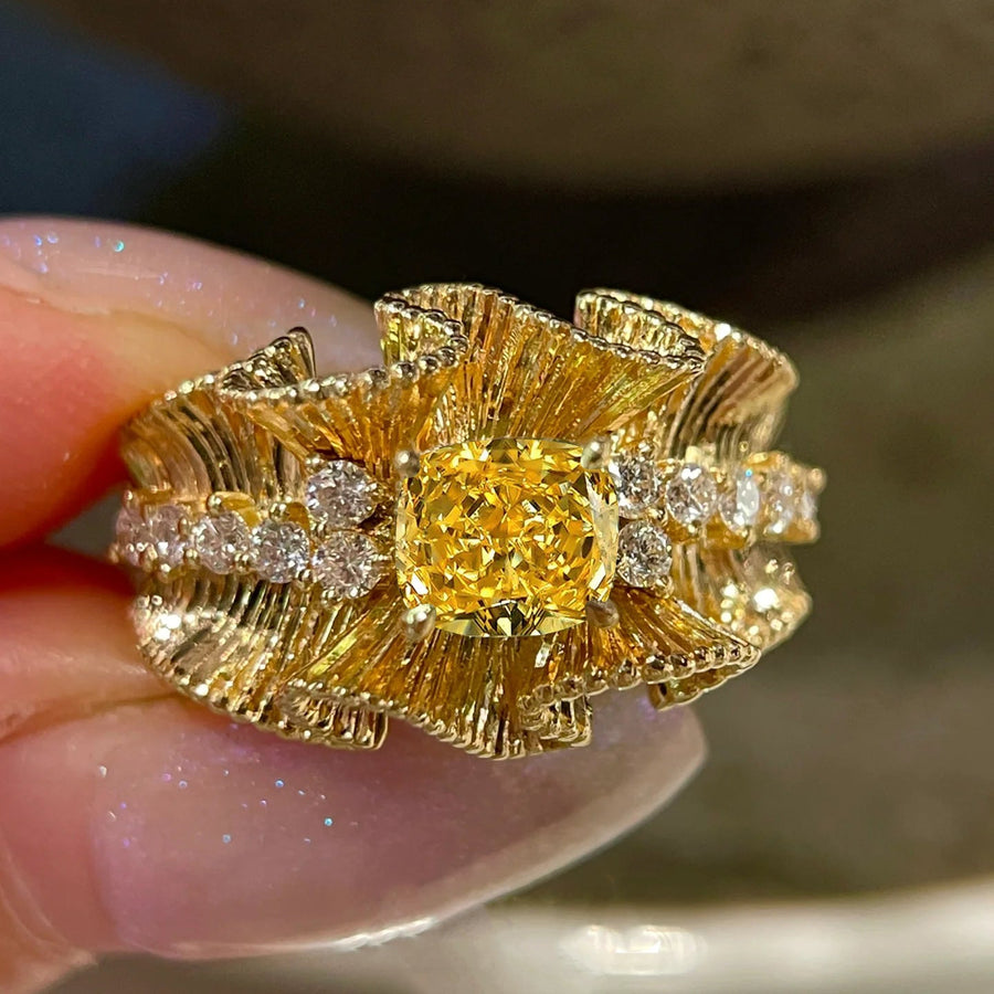Vintage Yellow Diamond Lace Frill Wrought Gold Women's Ring