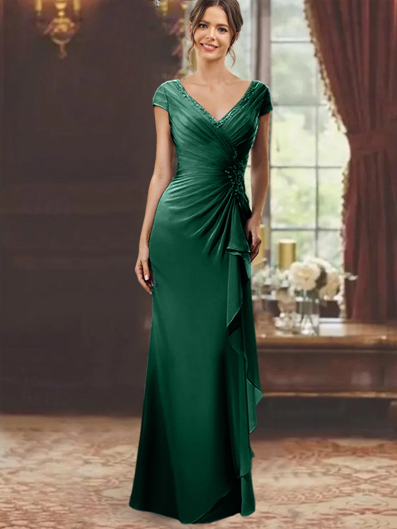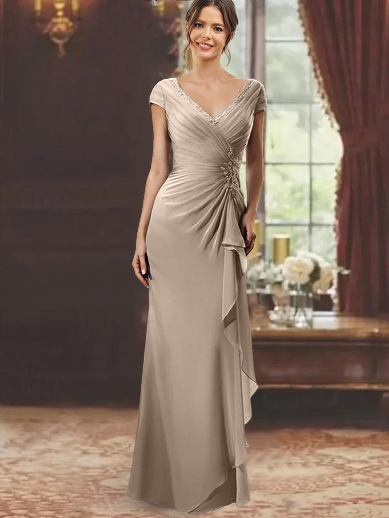 Sheath/Column V-Neck Short Sleeves Floor-Length Mother of the Bride Dresses With Ruffles & Appliques